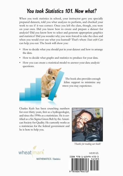 When you took statistics in school, your instructor gave you specially prepared datasets, told you what analyses to perform, and checked your work to see if it was correct. Once you left the class, though, you were on your own. Did you know how to create and prepare a dataset for analysis? Did you know how to select and generate appropriate graphics and statistics? Did you wonder why you were forced to take the class and when you would ever use what you learned? That's where Stats with Cats can help you out. The book will show you: How to decide what you should put in your dataset and how to arrange the data. How to decide what graphs and statistics to produce for your data. How you can create a statistical model to answer your data analysis questions. The book also provides enough feline support to minimize any stress you may experience. Charles Kufs has been crunching numbers for over thirty years, first as a hydrogeologist, and since the 1990s as a statistician. He is certified as a Six Sigma Green Belt by the American Society for Quality. He currently works as a statistician for the federal government and he is here to help you.
