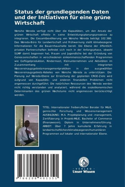 Wonsho Woreda verfügt nicht über die Kapazitäten, um den Ansatz der grünen Wirtschaft effektiv in seine Entwicklungsplanungsprozesse zu integrieren. Die Gesamtbevölkerung von Wonsho Woreda beträgt 102.380. Das Woreda-Büro für Landwirtschaft und Frühwarnung stellt klimabezogene Informationen für die Bauernhaushalte bereit. Die Ebene der öffentlich-privaten Partnerschaften befindet sich noch in der Anfangsphase, obwohl SLMP damit begonnen hat, Frauen und Jugendliche bei der Gründung von Genossenschaften in verschiedenen einkommensschaffenden Programmen wie Geflügelproduktion, Rindermast, Kleinunternehmen und Aktivitäten im Zusammenhang mit integrierten Wassereinzugsgebietsmanagementpraktiken in den ausgewählten Wassereinzugsgebiets-Kebeles von Wonsho Woreda zu unterstützen. Die Planung auf Woreda-Ebene zur Erreichung der geplanten CRGE-Ziele wird aufgrund von Kapazitäts- und anderen finanziellen Problemen nicht angemessen durchgeführt. Die natürlichen Ressourcen des Woreda werden nicht richtig verstanden und analysiert, während die sozioökonomischen Determinanten des grünen Wachstums nicht angemessen berücksichtigt werden.