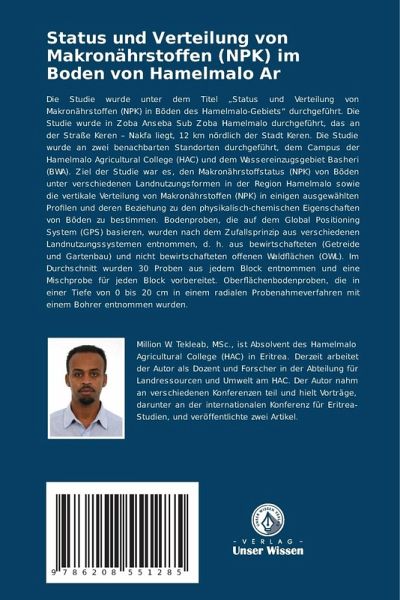Die Studie wurde unter dem Titel "Status und Verteilung von Makronährstoffen (NPK) in Böden des Hamelmalo-Gebiets" durchgeführt. Die Studie wurde in Zoba Anseba Sub Zoba Hamelmalo durchgeführt, das an der Straße Keren - Nakfa liegt, 12 km nördlich der Stadt Keren. Die Studie wurde an zwei benachbarten Standorten durchgeführt, dem Campus der Hamelmalo Agricultural College (HAC) und dem Wassereinzugsgebiet Basheri (BWA). Ziel der Studie war es, den Makronährstoffstatus (NPK) von Böden unter verschiedenen Landnutzungsformen in der Region Hamelmalo sowie die vertikale Verteilung von Makronährstoffen (NPK) in einigen ausgewählten Profilen und deren Beziehung zu den physikalisch-chemischen Eigenschaften von Böden zu bestimmen. Bodenproben, die auf dem Global Positioning System (GPS) basieren, wurden nach dem Zufallsprinzip aus verschiedenen Landnutzungssystemen entnommen, d. h. aus bewirtschafteten (Getreide und Gartenbau) und nicht bewirtschafteten offenen Waldflächen (OWL). Im Durchschnitt wurden 30 Proben aus jedem Block entnommen und eine Mischprobe für jeden Block vorbereitet. Oberflächenbodenproben, die in einer Tiefe von 0 bis 20 cm in einem radialen Probenahmeverfahren mit einem Bohrer entnommen wurden.