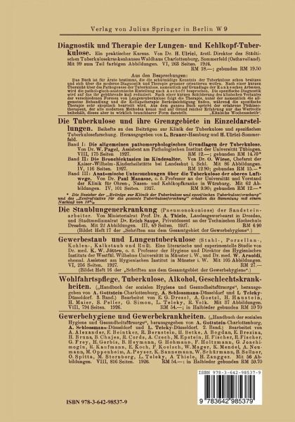 I. Begriff und Bezeichnung.- Staublunge und Staublungentuberkulose bzw. Pneumokoniose und Konio-tuberkulose.- II. Organischer und anorganischer Staub.- Einteilung.- Tierversuche mit organischem Staub.- Die verschiedenen Gewerbe mit organischem Staub.- III. Tierversuche zur Erzeugung reiner Pneumokoniose.- Altere und neuere Tierversuche.- Die erforderlichen Staubmengen.- Kieselsäurestaub, Marmor-, Schmirgel-, Granit- und Kohlenstaub.- Die Blockade der Lymphwege.- Entstehung von Fibrose.- Giftigkeit der Kieselsäure.- IV. Tierversuche zur Ermittelung der Beziehungen zwischen Staublunge und Tuberkulose.- MAVROGORDATOS Versuche mit geglühtem und ungeglühtem Staub.- Mit Tuberkuloseinfektion kombinierte Versuche mit Kieselsäure.- Versuche mit Granit-, Marmor-, mit Schmirgelstaub, mit Ruß, mit verschiedenen Staubarten und tuberkulöser Reinfektion.- Gefährlichkeitsskala der verschiedenen Staubarten.- V. Pathologische Anatomie.- Staubgehalt der menschlichen Staublunge.- Der Befund an der Leichenlunge.- Indurative Veränderungen.- Die Staubknoten.- Übergänge zur Tuberkulose.- Die Staublungentuberkulose.- Anhang: Über die Natur der Staubzellen.- VI. Röntgenologie.- Die drei röntgenologischen Stadien der Pneumokoniose.- Differentialdiagnose.- VII. Klinik.- Geringfügigkeit der klinischen Symptome.- Differentialdiagnose gegen Tuberkulose.- Lungensteine.- Elastische Fasern.- Bacillennachweis.- Tuberkulinprobe.- Komplementablenkung.- Langjährige klinische Beobachtung.- VIII. Latenzperiode.- Latenzperiode oder "effective period" für die verschiedenen Staubgewerbe.- IX. Häufigkeit der Pneumokoniose.- Die verschiedenen Staubgewerbe.- Häufigkeit der Kombination mit Tuberkulose.- Südafrikanische Statistik über die Häufigkeit in den Goldminen.- X. Hauptsterbealter undSterblichkeit.- Das Hauptsterbealter der Tockenschleifer und Steinbohrer im Gegensatz zu demjenigen der übrigen Staubarbeiter.- Die Sterblichkeit an Tuberkulose in den verschiedensten Staubberufen.- Diskrepanz zwischen den hohen Tuberkulosesterbeziffern und dem hohen Tuberkulosesterbealter bei den Staubarbeitern.- XI. Prognose und Behandlung.- XII. Der Einfluß hygienischer und sozialer Verhältnisse.- Der Einfluß der verschiedenen Staubarten, der Staubmenge.- Die Arbeiterauslese.- Gewerbehygienische Verhältnisse.- Soziale Verhältnisse.- Einfluß von Tuberkulose-Infektionsquellen.- XIII. Über die Staubgefahr im allgemeinen.- Hygienische Einschätzung der Staubgefahr.- XIV. Prophylaxe und gesetzliche Bestimmungen.- Verhütung der Staubentstehung.- Die Niederschlagung und die Beseitigung von Staub.- Atmungsmasken.- Die Arbeiterauslese.- Ausschluß der Tuberkulösen.- Staublunge und Staublungentuberkulose als Berufskrankheit oder gewerblicher Unfall.- Metallschleiferverordnungen.- Englische und südafrikanische Gesetzgebung.- Das WATKINS -PITCHFORD sche Institut.- XV. Tuberkulose der Angehörigen, Auswirkung der Tuberkulose und Staubarbeit auf die Konstitution.- Ältere und neuere Beobachtungen.- Mansfelder Statistik.- XVI. Die hauptsächlichsten Staubgewerbe.- 1. Gewerbe mit organischem Staub.- 2. Eisen- und Stahlstaub, Schleifstaub.- 3. Sandstein und Granit.- 4. Schiefer, Speckstein, Kalkstaub, Zement.- 5. Keramische Industrie.- 6. Kohlenbergbau.- 7. Blei-, Zinn-, Zink-, Gold- und Kupferschieferbergbau.- Das Gießfieber.- Schlußfolgerung.- XVII. Lungencarcinom bei Bergarbeitern.- XVIII. Die Staubinhalationstherapie.- Zusammenfassung.- Literatur.