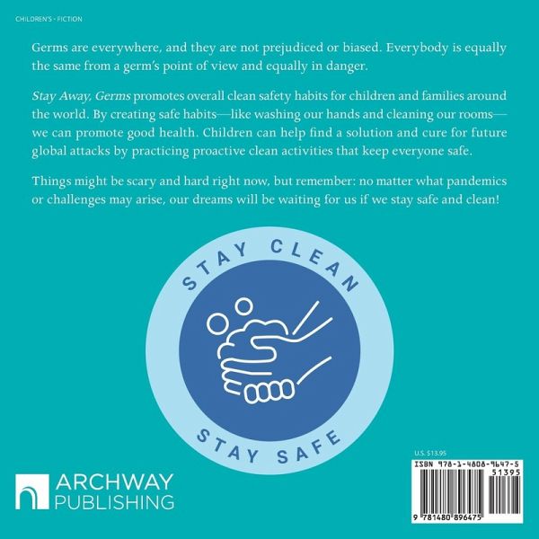 Germs are everywhere, and they are not prejudiced or biased. Everybody is equally the same from a germ's point of view and equally in danger. Stay Away, Germs promotes overall clean safety habits for children and families around the world. By creating safe habits-like washing our hands and cleaning our rooms-we can promote good health. Children can help find a solution and cure for future global attacks by practicing proactive clean activities that keep everyone safe. Things might be scary and hard right now, but remember: no matter what pandemics or challenges may arise, our dreams will be waiting for us if we stay safe and clean!