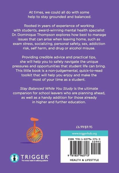 Want to make the most out of being a student? Award-winning mental health specialist Dr Dominique Thompson explores issues around leaving home, exam stress, socialising, safety, sex, and drugs, to help you succeed and truly enjoy your time as a student. Complemented by insights from real students, this useful guide provides credible advice, practical tips and exercises to help you safely navigate the unique pressures and opportunities that student life brings. Easy-to-read, visually appealing and convenient to carry, it's a non-judgemental toolkit for happiness and confidence. Stay Balanced While You Study is the ultimate companion for school-leavers planning ahead for university, as well as a handy addition for those already in higher and further education.