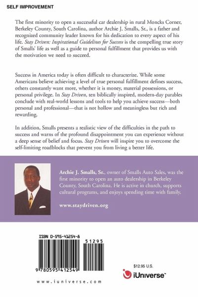 The first minority to open a successful car dealership in rural Moncks Corner, Berkeley County, South Carolina, author Archie J. Smalls, Sr., is a father and recognized community leader known for his dedication to every aspect of his life. Stay Driven: Inspirational Guidelines for Success is the compelling true story of Smalls' life as well as a guide to personal fulfillment that provides us with the motivation we need to succeed. Success in America today is often difficult to characterize. While some Americans believe achieving a level of true personal fulfillment defines success, others constantly want more, whether it is money, material possessions, or personal privilege. In Stay Driven, ten biblically inspired, modern-day parables conclude with real-world lessons and tools to help you achieve success-both personal and professional-that is not hollow and meaningless but rich and rewarding. In addition, Smalls presents a realistic view of the difficulties in the path to success and warns of the profound disappointment you can experience without a deep sense of belief and focus. Stay Driven will inspire you to overcome the self-limiting roadblocks that prevent you from living a better life.