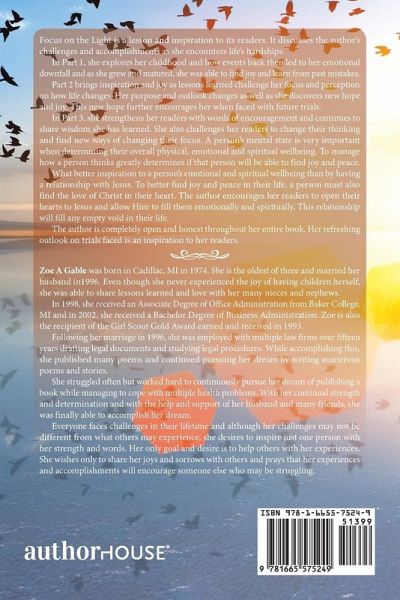 Focus on the Light is a lesson and inspiration to its readers. It discusses the author's challenges and accomplishments as she encounters life's hardships. In Part 1, she explores her childhood and how events back then led to her emotional downfall and as she grew and matured, she was able to find joy and learn from past mistakes. Part 2 brings inspiration and joy as lessons learned challenge her focus and perception on how life changes. Her purpose and outlook changes as well as she discovers new hope and joy. This new hope further encourages her when faced with future trials. In Part 3, she strengthens her readers with words of encouragement and continues to share wisdom she has learned. She also challenges her readers to change their thinking and find new ways of changing their focus. A person's mental state is very important when determining their overall physical, emotional and spiritual wellbeing. To manage how a person thinks greatly determines if that person will be able to find joy and peace. What better inspiration to a person's emotional and spiritual wellbeing than by having a relationship with Jesus. To better find joy and peace in their life, a person must also find the love of Christ in their heart. The author encourages her readers to open their hearts to Jesus and allow Him to fill them emotionally and spiritually. This relationship will fill any empty void in their life. The author is completely open and honest throughout her entire book. Her refreshing outlook on trials faced is an inspiration to her readers.