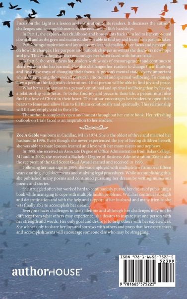 Focus on the Light is a lesson and inspiration to its readers. It discusses the author's challenges and accomplishments as she encounters life's hardships. In Part 1, she explores her childhood and how events back then led to her emotional downfall and as she grew and matured, she was able to find joy and learn from past mistakes. Part 2 brings inspiration and joy as lessons learned challenge her focus and perception on how life changes. Her purpose and outlook changes as well as she discovers new hope and joy. This new hope further encourages her when faced with future trials. In Part 3, she strengthens her readers with words of encouragement and continues to share wisdom she has learned. She also challenges her readers to change their thinking and find new ways of changing their focus. A person's mental state is very important when determining their overall physical, emotional and spiritual wellbeing. To manage how a person thinks greatly determines if that person will be able to find joy and peace. What better inspiration to a person's emotional and spiritual wellbeing than by having a relationship with Jesus. To better find joy and peace in their life, a person must also find the love of Christ in their heart. The author encourages her readers to open their hearts to Jesus and allow Him to fill them emotionally and spiritually. This relationship will fill any empty void in their life. The author is completely open and honest throughout her entire book. Her refreshing outlook on trials faced is an inspiration to her readers.
