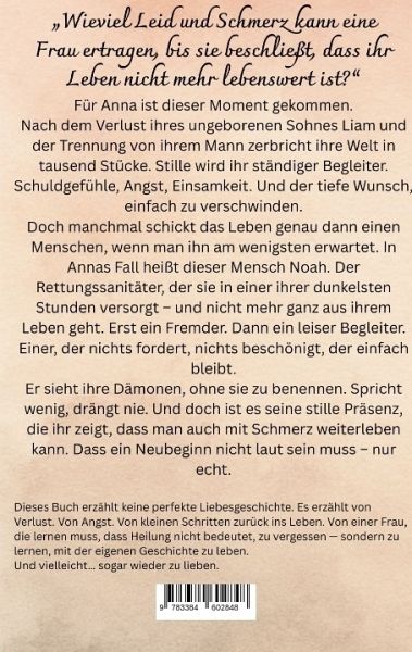 Wie viel Schmerz kann eine Frau ertragen, bevor sie beschließt, dass ihr Leben nicht mehr lebenswert ist?Anna steht am Rand. Nach dem Verlust ihres Kindes, einer zerbrochenen Ehe und einer Trauer, die jede Farbe aus ihrem Leben gezogen hat, bleibt nur noch Stille. Und Leere. Bis ein Mann in ihr Leben tritt, der keine Antworten gibt, aber Fragen stellt, die sie lange nicht mehr gehört hat. Noah, ein Rettungssanitäter, begegnet ihr nicht als Held - sondern als jemand, der einfach da ist. Leise. Unaufdringlich. Und bereit, sie in ihrem eigenen Tempo zurück ins Leben zu begleiten."Zwischen den Zeilen soll man atmen können" - mit dieser Haltung erzählt dieser Roman nicht von der großen Liebe, sondern von etwas Tieferem: Vertrauen, Verlust, Mut und dem zarten Versuch, wieder Boden unter den Füßen zu finden.Ein leiser, kraftvoller Roman über einen Weg, den niemand freiwillig geht - und der dennoch gegangen werden muss. Für alle, die selbst durch Dunkelheit gegangen sind. Und für alle, die verstehen wollen, wie viel Stärke in echter Verletzlichkeit liegt.