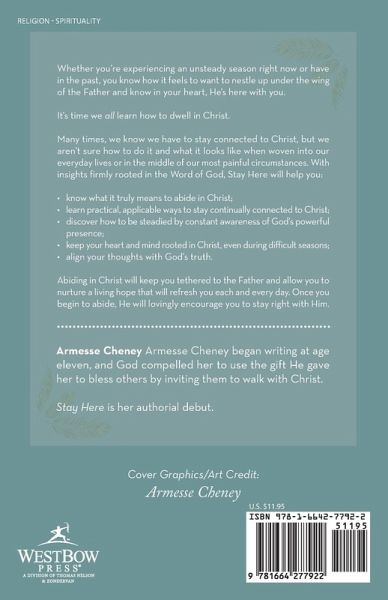 Whether you're experiencing an unsteady season right now or have in the past, you know how it feels to want to nestle up under the wing of the Father and know in your heart, He's here with you. It's time we all learn how to dwell in Christ. Many times, we know we have to stay connected to Christ, but we aren't sure how to do it and what it looks like when woven into our everyday lives or in the middle of our most painful circumstances. With insights firmly rooted in the Word of God, Stay Here will help you: know what it truly means to abide in Christ; learn practical, applicable ways to stay continually connected to Christ; discover how to be steadied by constant awareness of God's powerful presence; keep your heart and mind rooted in Christ, even during difficult seasons; align your thoughts with God's truth. Abiding in Christ will keep you tethered to the Father and allow you to nurture a living hope that will refresh you each and every day. Once you begin to abide, He will lovingly encourage you to stay right with Him.