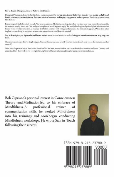 Bob Cipriano spent years as a professional teacher/trainer, conducting academic and corporate workshops in America and other parts of the world. His work focused primarily on an array of communication skills. Over time, his personal interest in Consciousness Theory, Meditation, the Tao and Zen led to his embrace of Mindfulness. It emerged for him as a key not only to attention and its resulting inner peace, but also to communication among people. He began to incorporate Mindfulness into his various trainings, adding new depth to writing, time management, customer service, project management and presentation seminars. He began conducting Mindfulness workshops as a result, and wrote Stay in Touch following their success. He holds an MA from the University of Rhode Island and a BA from the University of Connecticut. His background, in addition to teaching, includes corporate management and marketing. He lives in Exeter, Rhode Island with his family.