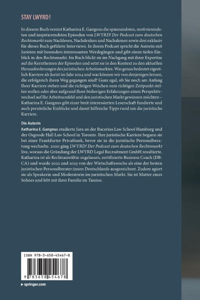 In diesem Buch vereint Katharina E. Gangnus die spannendsten, motivierendsten und inspirierendsten Episoden von LWYRD! Der Podcast zum deutschen Rechtsmarkt zum Nachlesen, Nachdenken und Nachahmen sowie drei exklusiv für dieses Buch geführte Interviews. In ihrem Podcast spricht die Autorin mit Juristen mit besonders interessanten Werdegängen und gibt einen tiefen Einblick in den Rechtsmarkt. Im Buch blickt sie im Nachgang mit ihrer Expertise auf die Kernthemen der Episoden und setzt sie in den Kontext zu den aktuellen Herausforderungen des juristischen Arbeitsmarktes. Was genau bedeutet eigentlich Karriere als Jurist im Jahr 2024 und was können wir von denjenigen lernen, die erfolgreich ihren Weg gegangen sind? Ganz egal, ob Sie noch am Anfang Ihrer Karriere stehen und die richtigen Weichen zum richtigen Zeitpunkt stellen wollen oder aber aufgrund Ihrer bisherigen Erfahrungen einen Perspektivwechsel auf Ihr Arbeitsumfeld und den juristischen Markt gewinnen möchten - KatharinaE. Gangnus gibt einer breit interessierten Leserschaft fundierte und auch persönliche Einblicke und damit hilfreiche Tipps rund um die juristische Karriere.