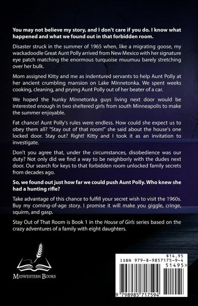 You may not believe my story, and I don't care if you do. I know what happened and what we found out in that forbidden room. Disaster struck in the summer of 1965 when, like a migrating goose, my wackadoodle Great Aunt Polly arrived from New Mexico with her signature eye patch matching the enormous turquoise muumuu barely stretching over her bulk. Mom assigned Kitty and me as indentured servants to help Aunt Polly at her ancient crumbling mansion on Lake Minnetonka. We spent weeks cooking, cleaning, and prying Aunt Polly out of her beater of a car. We hoped the hunky Minnetonka guys living next door would be interested enough in two sheltered girls from south Minneapolis to make the summer enjoyable. Fat chance! Aunt Polly's rules were endless. How could she expect us to obey them all? "Stay out of that room!" she said about the house's one locked door. Stay out? Right! Kitty and I took it as an invitation to investigate. Don't you agree that, under the circumstances, disobedience was our duty? Not only did we find a way to be neighborly with the dudes next door. Our search for keys to that forbidden room unlocked family secrets from decades ago. So, we found out just how far we could push Aunt Polly. Who knew she had a hunting rifle? Take advantage of this chance to fulfill your secret wish to visit the 1960s. Buy my coming-of-age story. I promise it will make you giggle, cringe, squirm, and gasp. Stay Out of That Room is Book 1 in the House of Girls series based on the crazy adventures of a family with eight daughters.