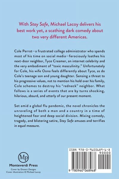 Stay Safe is Michael Lacoy's best work yet, a scathing dark comedy about two very different Americas. Cole Perrot -- a frustrated college administrator who spends most of his time on social media -- ferociously loathes his next-door neighbor, Tyce Creamer, an internet celebrity and the very embodiment of "toxic masculinity." Unfortunately for Cole, his wife Oona feels differently about Tyce, as do Cole's teenage son and young daughter. Sensing a threat to his progressive values, not to mention his hold over his family, Cole secretly declares war on his "redneck" neighbor. What follows is a series of events that are by turns shocking, hilarious, absurd, and perfectly of our present moment. Set amid a global flu pandemic, the novel chronicles the unraveling of both a man and a country in a time of heightened fear and deep social division. Mixing comedy, tragedy, and blistering satire, Stay Safe amuses and terrifies in equal measure.