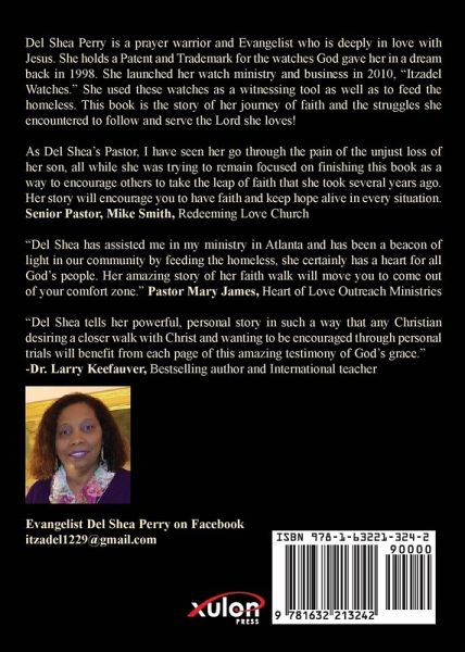 Del Shea Perry is a prayer warrior and Evangelist who is deeply in love with Jesus. She holds a Patent and Trademark for the watches God gave her in a dream back in 1998. She launched her watch ministry and business in 2010, "Itzadel Watches." She used these watches as a witnessing tool as well as to feed the homeless. This book is the story of her journey of faith and the struggles she encountered to follow and serve the Lord she loves! As Del Shea's Pastor, I have seen her go through the pain of the unjust loss of her son, all while she was trying to remain focused on finishing this book as a way to encourage others to take the leap of faith that she took several years ago. Her story will encourage you to have faith and keep hope alive in every situation. Senior Pastor, Mike Smith, Redeeming Love Church "Del Shea has assisted me in my ministry in Atlanta and has been a beacon of light in our community by feeding the homeless, she certainly has a heart for all God's people. Her amazing story of her faith walk will move you to come out of your comfort zone." Pastor Mary James, Heart of Love Outreach Ministries "Del Shea tells her powerful, personal story in such a way that any Christian desiring a closer walk with Christ and wanting to be encouraged through personal trials will benefit from each page of this amazing testimony of God's grace." -Dr. Larry Keefauver, Bestselling author and International teacher Evangelist Del Shea Perry on Facebook itzadel1229@gmail.com