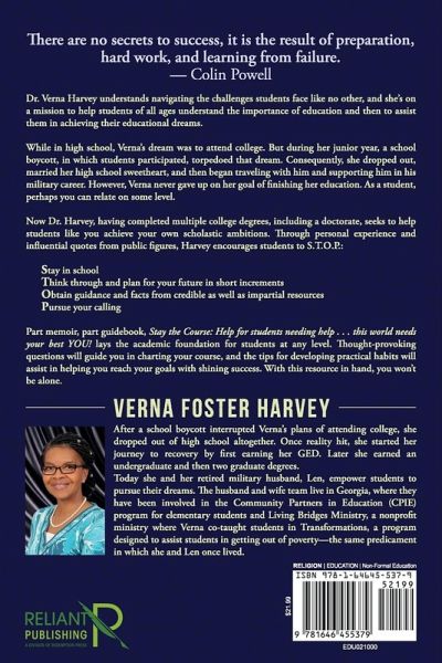 There are no secrets to success, it is the result of preparation, hard work, and learning from failure. -Colin Powell Dr. Verna Harvey understands navigating the challenges students face like no other, and she's on a mission to help students of all ages understand the importance of education and then to assist them in achieving their educational dreams. While in high school, Verna's dream was to attend college. But during her junior year, a school boycott, in which students participated, torpedoed that dream. Consequently, she dropped out, married her high school sweetheart, and then began traveling with him and supporting him in his military career. However, Verna never gave up on her goal of finishing her education. As a student, perhaps you can relate on some level. Now Dr. Harvey, having completed multiple college degrees, including a doctorate, seeks to help students like you achieve your own scholastic ambitions. Through personal experience and influential quotes from public figures, Harvey encourages students to S.T.O.P.: Stay in school Think through and plan for your future in short increments Obtain guidance and facts from credible as well as impartial resources Pursue your calling Part memoir, part guidebook, Stay the Course: Help for students needing help .¿. . this world needs your best YOU! lays the academic foundation for students at any level. Thought-provoking questions will guide you in charting your course, and the tips for developing practical habits will assist in helping you reach your goals with shining success. With this resource in hand, you won't be alone.