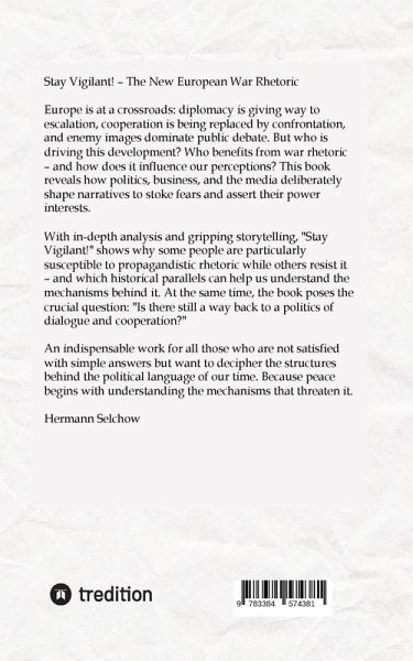 Stay Vigilant! - The New War Rhetoric in EuropeHow Enemy Images Emerge, Who Benefits from Them - and How We Can Maintain the Path to PeaceIn a time of geopolitical tensions and ongoing media crises, a dangerous language dominates our political landscape: war rhetoric. But how do these narratives emerge? Who constructs enemy images - and for what interest? "Stay Vigilant!" takes you on a well-founded, unsparing analysis of current political communication in Europe and reveals the economic and strategic forces behind the EU's aggressive course.- Who are the real beneficiaries of war rhetoric?- What role do the media, business, and transatlantic networks play?- How do fear and propaganda influence our perceptions?- Why are some people more susceptible to these narratives than others?- What alternatives are there for a more peaceful, diplomatic future?This book combines political science analysis with gripping storytelling and not only reveals the mechanisms behind the current escalatory rhetoric, but also offers solutions: How can Europe return to a policy of dialogue, diplomacy, and cooperation? And what role can we as citizens play in this?For all those who want to understand the world behind the headlines and not be guided by simple enemy images.Read now and join the conversation - because peace begins with knowledge!