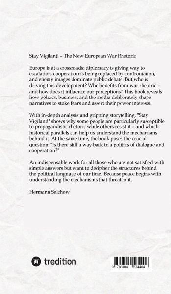 Stay Vigilant! - The New War Rhetoric in EuropeHow Enemy Images Emerge, Who Benefits from Them - and How We Can Maintain the Path to PeaceIn a time of geopolitical tensions and ongoing media crises, a dangerous language dominates our political landscape: war rhetoric. But how do these narratives emerge? Who constructs enemy images - and for what interest? "Stay Vigilant!" takes you on a well-founded, unsparing analysis of current political communication in Europe and reveals the economic and strategic forces behind the EU's aggressive course.- Who are the real beneficiaries of war rhetoric?- What role do the media, business, and transatlantic networks play?- How do fear and propaganda influence our perceptions?- Why are some people more susceptible to these narratives than others?- What alternatives are there for a more peaceful, diplomatic future?This book combines political science analysis with gripping storytelling and not only reveals the mechanisms behind the current escalatory rhetoric, but also offers solutions: How can Europe return to a policy of dialogue, diplomacy, and cooperation? And what role can we as citizens play in this?For all those who want to understand the world behind the headlines and not be guided by simple enemy images.Read now and join the conversation - because peace begins with knowledge!