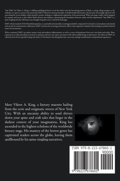 "Stay Woke" by Viktor A. King is a chilling multilingual horror novel that delves into the harrowing journey of Ruth, a young, ailing teenager, as she embarks on a quest to uncover the mysterious DMT within her classmate Jennifer. As Ruth's health deteriorates, she becomes increasingly obsessed with unraveling the secrets hidden within Jennifer's psyche, leading to a nightmarish exploration of the paranormal. With each page, readers will be gripped by suspense and terror as they follow Ruth's descent into darkness, questioning the boundaries between reality and the supernatural. "Stay Woke" is a spine-tingling tale that will haunt your thoughts long after you've turned the final page. DMT, which stands for N,N-Dimethyltryptamine, is a powerful and naturally occurring psychedelic compound. It is found in certain plants and animals and can also be synthesized in a laboratory. DMT is known for its strong psychoactive effects when ingested or inhaled, often leading to profound altered states of consciousness. When consumed, DMT can induce intense visual and auditory hallucinations, as well as a sense of detachment from one's own body and reality. These experiences are often described as mystical or spiritual, and users may report encounters with otherworldly beings or dimensions. The effects of DMT are relatively short-lived, typically lasting only about 15-30 minutes, but during that time, users may undergo transformative and profound experiences.