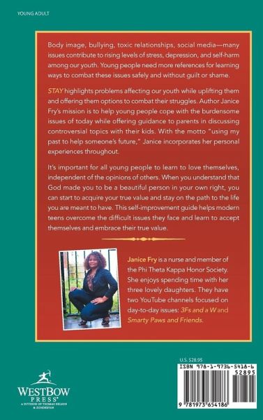 Body image, bullying, toxic relationships, social media-many issues contribute to rising levels of stress, depression, and self-harm among our youth. Young people need more references for learning ways to combat these issues safely and without guilt or shame. STAY highlights problems affecting our youth while uplifting them and offering them options to combat their struggles. Author Janice Fry's mission is to help young people cope with the burdensome issues of today while offering guidance to parents in discussing controversial topics with their kids. With the motto "using my past to help someone's future," Janice incorporates her personal experiences throughout. It's important for all young people to learn to love themselves, independent of the opinions of others. When you understand that God made you to be a beautiful person in your own right, you can start to acquire your true value and stay on the path to the life you are meant to have. This self-improvement guide helps modern teens overcome the difficult issues they face and learn to accept themselves and embrace their true value.