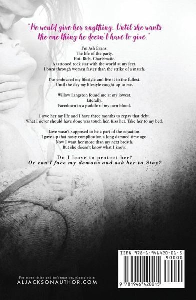 A small town, rockstar romance from NYT and USA Today bestselling author A.L. Jackson I'm Ash Evans. The life of the party. Hot. Rich. Charismatic. A tattooed rock star with the world at my feet. I burn through women faster than the strike of a match. I've embraced my lifestyle and live it to the fullest. Until the day my lifestyle caught up to me. Willow Langston found me at my lowest. Literally. Facedown in a puddle of my own blood. I owe her my life and I have three months to repay that debt. What I never should have done was touch her. Kiss her. Take her to my bed. Love wasn't supposed to be a part of the equation. I gave up that nasty complication a long damned time ago. Now I want her more than my next breath. But she doesn't know what I know. Do I leave to protect her? Or can I face my demons and ask her to Stay?