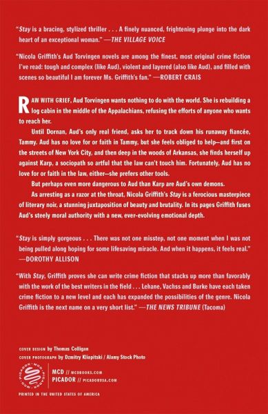 "Razor sharp." -New York Times ""If Jack Reacher had a sister, she'd be Aud Torvingen . . . he would love her, but he'd be a little scared of her, too." -Lee Child Aud Torvingen returns-against her better instincts-scarred, heartbroken, changed, but tougher and rougher than ever. Raw with grief, Aud Torvingen wants nothing to do with the world. She is rebuilding a log cabin in the middle of the Appalachians, refusing the efforts of anyone who wants to reach her. Until Dornan, Aud's only real friend, asks her to track down his runaway fiancée, Tammy. Aud has no love for or faith in Tammy, but she feels obliged to help-and first on the streets of New York City, and then deep in the woods of Arkansas, she finds herself up against Karp, a sociopath so artful that the law can't touch him. Fortunately, Aud has no love for or faith in the law, either-she prefers other tools. But perhaps even more dangerous to Aud than Karp are Aud's own demons. As arresting as a razor at the throat, Nicola Griffith's Stay is a ferocious masterpiece of literary noir, a stunning juxtaposition of beauty and brutality. In its pages Griffith fuses Aud's steely moral authority with a new, ever-evolving emotional depth.