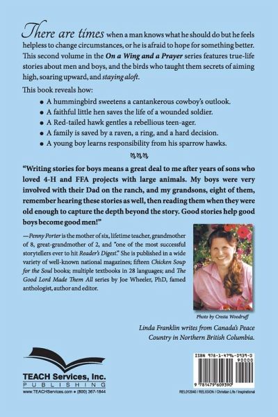 There are times when a man knows what he should do but he feels helpless to change circumstances, or he is afraid to hope for something better. This second volume in the On a Wing and a Prayer series features true-life stories about men and boys, and the birds who taught them secrets of aiming high, soaring upward, and staying aloft. This book reveals how: A hummingbird sweetens a cantankerous cowboy’s outlook. A faithful little hen saves the life of a wounded soldier. A Red-tailed hawk gentles a rebellious teen-ager. A family is saved by a raven, a ring, and a hard decision. A young boy learns responsibility from his sparrow hawks.