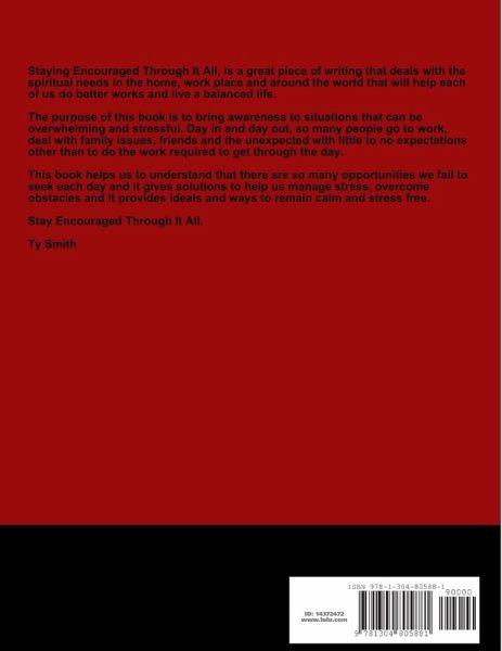 Staying Encouraged Through It AlI, is a great piece of writing that deals with the spiritual need in the home, work place and around the world that will help each of us do better works and live a balanced life. The purpose of this book is to bring awareness to situations that can be overwhelming and stressful. Day in and day out, so many people go to work, deal with family issues, friends and the unexpected with little to no expectations other than to do the work required to get through the day. This book helps up to understand that there are so many opportunities we fail to seek each day and it gives solutions to help us many stress, overcome obstacles and it provides ideals and ways to remain calm and stress free. In this book you will find stories and examples of life experiences that can be identified by you and your walk in life. There are scriptures and inspired wise thoughts shared in this book to encourage you to keep moving during your challenging times.