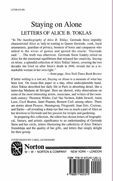 On tissue-thin paper in a tiny, often undecipherable hand, Alice Toklas described her daily life in Paris in absorbing detail, like a latter-day Madame de Sévigné. Here are shrewd, witty observations on some of the most interesting artists, musicians, and writers of the twentieth century: Thornton Wilder, Carl Van Vechten, Edith Sitwell, Anita Loos, Cecil Beaton, Janet Flanner, Bennett Cerf, among others. There are stories about Picasso, Hemingway, Fitzgerald, Juan Gris, Cocteau, and Sartre--all revealing a sharp eye that was as much a part of Alice as her devotion to Gertrude and her passion for recipes and gardening. In preparing this collection, the editor has chosen letters of biographical, literary, and artistic significance to an understanding of Gertrude Stein and her circle, letters illustrating the catholicity of Alice Toklas's friendships and the quality of her gifts, and letters that simply delight for their gossip.