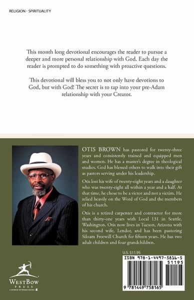 This month long devotional encourages the reader to pursue a deeper and more personal relationship with God. Each day the reader is prompted to do something with proactive questions. This devotional will bless you to not only have devotions to God, but with God! The secret is to tap into your pre-Adam relationship with your Creator.