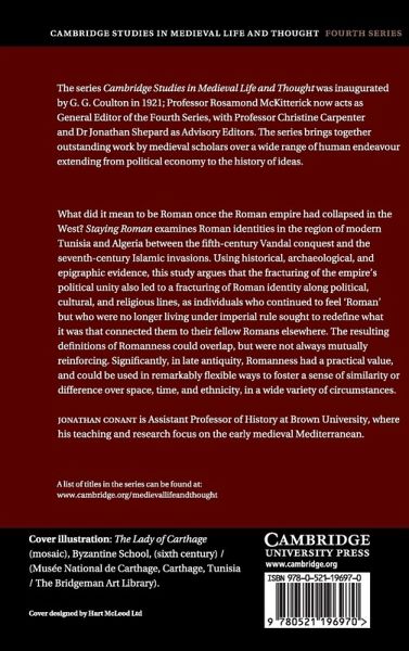 What did it mean to be Roman once the Roman Empire had collapsed in the West? Staying Roman examines Roman identities in the region of modern Tunisia and Algeria between the fifth-century Vandal conquest and the seventh-century Islamic invasions. Using historical, archaeological and epigraphic evidence, this study argues that the fracturing of the empire's political unity also led to a fracturing of Roman identity along political, cultural and religious lines, as individuals who continued to feel 'Roman' but who were no longer living under imperial rule sought to redefine what it was that connected them to their fellow Romans elsewhere. The resulting definitions of Romanness could overlap, but were not always mutually reinforcing. Significantly, in late antiquity Romanness had a practical value, and could be used in remarkably flexible ways to foster a sense of similarity or difference over space, time and ethnicity, in a wide variety of circumstances.