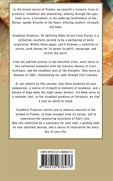 Steadfast Promises: 26 Uplifting Bible Verses From Psalms . In the lyrical verses of Psalms, we unearth a treasure trove of promises-steadfast and unwavering, echoing through the ages. Each verse, a testament to the enduring faithfulness of the Divine, speaks directly to the heart, offering comfort, strength, and hope. Steadfast Promises: 26 Uplifting Bible Verses From Psalms is a collection carefully curated to be a wellspring of daily inspiration. Within these pages, you'll discover a selection of verses, each chosen for its power to uplift, encourage, and fortify the spirit. From the jubilant praises to the heartfelt cries, every verse in this collection resonates with the timeless themes of trust, resilience, and the steadfast love of the Almighty. They serve as beacons of light, illuminating our path through life's journey. As you embark on this journey, may these promises be your companions, a source of strength in moments of weakness, and a beacon of hope when the night seems darkest. Let them serve as a reminder that, in the steadfast promises of Scripture, we find a rock on which to stand. Steadfast Promises invites you to immerse yourself in the wisdom of Psalms, to draw strength from its verses, and to experience the unwavering assurance of God's love. May this collection be a sanctuary for your soul, a guiding light on your spiritual journey, and a source of inspiration for every day of your life.