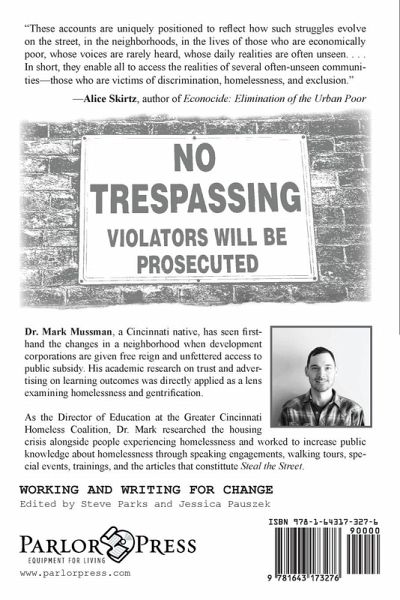 Steal the Street is a collection of short articles focused on gentrification, public space, and community voice. The articles were written for Streetvibes, a street paper in Cincinnati, Ohio, from 2015 through 2019. The focus of Streetvibes is homelessness, so each article focuses on different aspects of homelessness and inequity in Cincinnati, much of it centered around the rapidly gentrifying neighborhood of Over-the-Rhine. Articles include original photographs that further the narratives by providing evidence and perspectives enforced throughout each chapter. The forward is written by Alice Skirtz, author of Econocide. The housing crisis has been especially pronounced since the 2008 economic crisis. Since then, millions of Americans have been thrust into homelessness and removed from their homes. With the housing crisis growing due to the pandemic and continued neoliberalism, more communities will be displaced and transformed into safe havens for the growth of exclusionary generational wealth. Steal the Street provides a solid foundation to interpret current events and helps us to consider a different future, one without homelessness. About the Author Mark Mussman's previous roles included leadership in adult basic education, workforce development, volunteer coordination, and AmeriCorps service. As an education expert, Mussman brings strategies for community education and a desire to build community connections. A Cincinnati native, Mussman graduated from Walnut Hills High School, where he helped co-found the first Cincinnati high school-based Gay Straight Alliance. Mussman received his Bachelor of Philosophy from the Western College Program at Miami University after working on projects with the Miami Nation of Oklahoma, The National Underground Railroad Freedom Center, and JumpStart, Middletown. At the University of Cincinnati, Mussman's research focused on commercialism and student trust. After earning an MEd in Educational Foundations and Urban Educational Leadership, and a Certificate of Peace Studies, Mussman received his PhD in Educational Studies. As an AmeriCorps community volunteer, Mussman provided direct instruction to community-based GED school participants through the Urban Appalachian Council and the Northside Community School. Mussman continued his GED instruction at various community sites until embarking on the CAP513 Project. Through an individual grant from People's Liberty, Mussman founded the Creative App Project (CAP513) in 2015, which developed the first mobile app for the Safe and Supported Initiative, a partnership between Lighthouse Youth Services, Human Rights Campaign, HUD, and many other locally-based partner organizations, aimed at reducing instances of LGBTQ+ homelessness among teens and young adults.