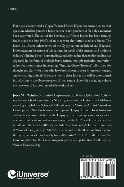 Have you encountered a Gypsy Vanner Horse? If you can answer yes to that question, whether you are a horse person or not you have if for only a moment been captivated. The out of the box beauty of these horses has been turning heads since the late 1990s when they were first introduced as a breed. The horse is a lifetime achievement of the Gypsy culture in Ireland and England. However, given the nature of this culture, the world of the internet, and the horse industrys driving force horse trading, confusion rather than understanding has appeared in the form of multiple breed names, multiple registries, and variety rather than consistency in breeding. Stealing Gypsy Treasure offers food for thought and clarity for those who have been drawn to these mysteriously magic and enchanting animals. If you are new to these horses this will be a welcomed introduction to the Gypsy people and how nature chose this intriguing culture to create one of its most remarkable works of art.