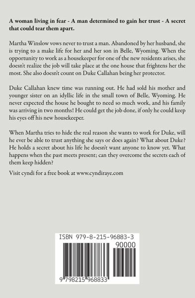 A woman living in fear - A man determined to gain her trust - A secret that could tear them apart. Martha Winslow vows never to trust a man. Abandoned by her husband, she is trying to a make life for her and her son in Belle, Wyoming. When the opportunity to work as a housekeeper for one of the new residents arises, she doesn't realize the job will take place at the one house that frightens her the most. She also doesn't count on Duke Callahan being her protector. Duke Callahan knew time was running out. He had sold his mother and younger sister on an idyllic life in the small town of Belle, Wyoming. He never expected the house he bought to need so much work, and his family was arriving in two months! He could get the job done, if only he could keep his eyes off his new housekeeper. When Martha tries to hide the real reason she wants to work for Duke, will he ever be able to trust anything she says or does again? What about Duke? He holds a secret about his life he doesn't want anyone to know yet. What happens when the past meets present; can they overcome the secrets each of them keep hidden?