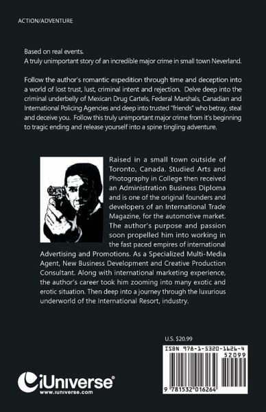 Based on real events. A truly unimportant story of an incredible major crime in small town Neverland. Follow the author's romantic expedition through time and deception into a world of lost trust, lust, criminal intent and rejection. Delve deep into the criminal underbelly of Mexican Drug Cartels, Federal Marshals, Canadian and International Policing Agencies and deep into trusted "friends" who betray, steal and deceive you. Follow this truly unimportant major crime from it's beginning to tragic ending and release yourself into a spine tingling adventure.