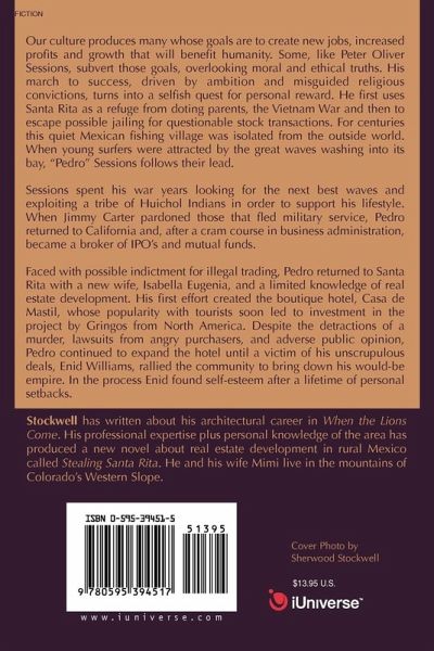 Our culture produces many whose goals are to create new jobs, increased profits and growth that will benefit humanity. Some, like Peter Oliver Sessions, subvert those goals, overlooking moral and ethical truths. His march to success, driven by ambition and misguided religious convictions, turns into a selfish quest for personal reward. He first uses Santa Rita as a refuge from doting parents, the Vietnam War and then to escape possible jailing for questionable stock transactions. For centuries this quiet Mexican fishing village was isolated from the outside world. When young surfers were attracted by the great waves washing into its bay, "Pedro" Sessions follows their lead. Sessions spent his war years looking for the next best waves and exploiting a tribe of Huichol Indians in order to support his lifestyle. When Jimmy Carter pardoned those that fled military service, Pedro returned to California and, after a cram course in business administration, became a broker of IPO's and mutual funds. Faced with possible indictment for illegal trading, Pedro returned to Santa Rita with a new wife, Isabella Eugenia, and a limited knowledge of real estate development. His first effort created the boutique hotel, Casa de Mastil, whose popularity with tourists soon led to investment in the project by Gringos from North America. Despite the detractions of a murder, lawsuits from angry purchasers, and adverse public opinion, Pedro continued to expand the hotel until a victim of his unscrupulous deals, Enid Williams, rallied the community to bring down his would-be empire. In the process Enid found self-esteem after a lifetime of personal setbacks.