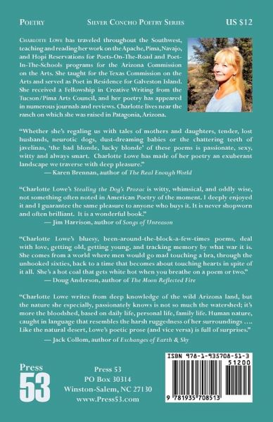 "Charlotte Lowe's Stealing the Dog's Prozac, is witty, whimsical, and oddly, wise, not something often noted in American Poetry of the moment. I deeply enjoyed it and I guarantee the same pleasure to anyone who buys it. It is never shopworn and often brilliant. It is a wonderful book." - Jim Harrison, author of Songs of Unreason (a Silver Concho Poetry Series selection, edited by Pamela Uschuk and William Pitt Root)