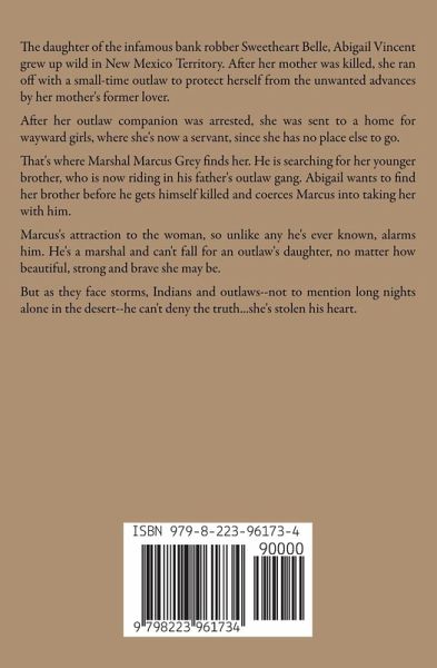 The daughter of the infamous bank robber Sweetheart Belle, Abigail Vincent grew up wild in New Mexico Territory. After her mother was killed, she ran off with a small-time outlaw to protect herself from the unwanted advances by her mother's former lover. After her outlaw companion was arrested, she was sent to a home for wayward girls, where she's now a servant, since she has no place else to go. That's where Marshal Marcus Grey finds her. He is searching for her younger brother, who is now riding in his father's outlaw gang. Abigail wants to find her brother before he gets himself killed and coerces Marcus into taking her with him. Marcus's attraction to the woman, so unlike any he's ever known, alarms him. He's a marshal and can't fall for an outlaw's daughter, no matter how beautiful, strong and brave she may be. But as they face storms, Indians and outlaws--not to mention long nights alone in the desert--he can't deny the truth...she's stolen his heart.
