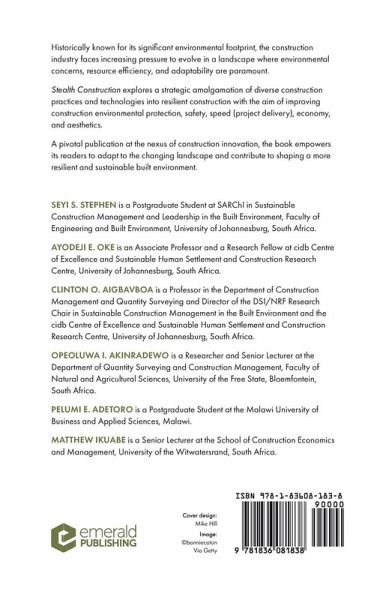 Stealth Construction explores a strategic amalgamation of diverse construction practices and technologies into resilient construction with the aim of improving construction environmental protection, safety, speed (project delivery), economy, and aesthetics.