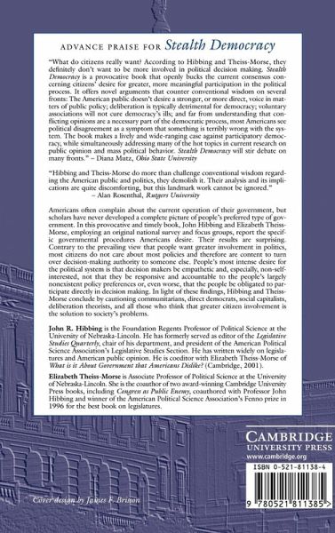 Americans often complain about the operation of their government, but scholars have never developed a complete picture of people's preferred type of government. In this provocative and timely book, Hibbing and Theiss-Morse, employing an original national survey and focus groups, report the governmental procedures Americans desire. Contrary to the prevailing view that people want greater involvement in politics, most citizens do not care about most policies and therefore are content to turn over decision-making authority to someone else. People's wish for the political system is that decision makers be empathetic and, especially, non-self-interested, not that they be responsive and accountable to the people's largely nonexistent policy preferences or, even worse, that the people be obligated to participate directly in decision making. Hibbing and Theiss-Morse conclude by cautioning communitarians, direct democrats, social capitalists, deliberation theorists, and all those who think that greater citizen involvement is the solution to society's problems.