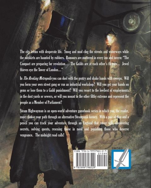 The city teems with desperate life. Smog and mug clog the streets and waterways while the outskirts are haunted by robbers. Rumours are muttered in every inn and tavern: "The Compact are preparing for revolution... The Guilds are at each other's throats... Jewel thieves eye the Tower of London..." In The Reeking Metropolis you can duel with the gentry and shake hands with sweeps. Will you form your own street gang or run an industrial workshop? Will you get your hands on gems or lose them to a guild punishment? Will you resort to the lowliest of employments in the dust yards or sewers, or will you mount to the other filthy extreme and represent the people as a Member of Parliament? Steam Highwayman is an open-world adventure gamebook series in which you, the reader, must choose your path through an alternative Steampunk history. With a pair of dice and a pencil you can track your adventure through an England that never was, discovering secrets, solving quests, rescuing those in need and punishing those who deserve vengeance. The midnight road calls!