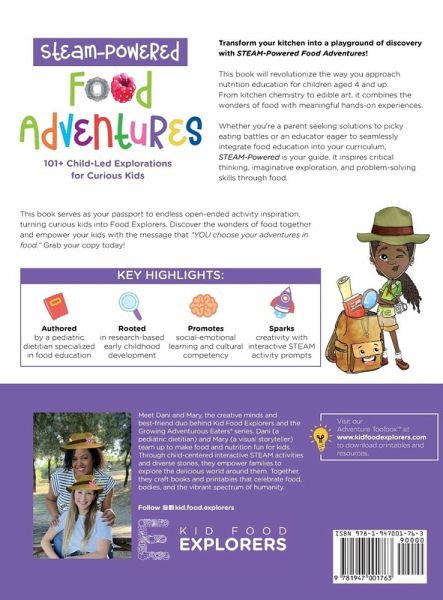 Discover the Joy of Learning with Food! Transform your kitchen into a wondrous playground with STEAM-Powered Food Adventures! Tailored for children aged 4+, this innovative book is set to change the way you think about nutrition and education. Dive into a world where kitchen chemistry, edible art, and global flavors blend into meaningful, hands-on STEAM activities. ¿ End Picky Eating: Say goodbye to mealtime struggles and watch as your children become brave Food Explorers, eager to learn and build confidence to taste. ¿ Educator's Treasure: Seamlessly integrate this rich resource into your curriculum, fostering critical thinking, imaginative exploration, and problem-solving with every delicious lesson. ¿ Parent & Child Bonding: Join forces in the kitchen and beyond, empowering your kids with the message that, "YOU choose your adventures in food adventures!"Why Choose This Book?Pediatric Nutrition Insight: Authored by a pediatric dietitian, this resource merges expert knowledge with the latest findings in children's health, feeding practices, and eating disorder prevention. Child Development Research: Drawing from contemporary studies, these STEAM activities are tailored for young minds, promoting cognitive growth and developmental milestones. Early Learning Foundations: The book's content is deeply rooted in up-to-date childhood development research, offering strategies for nurturing learning in children ages 4+. Social-Emotional Skills: It focuses on emotional intelligence and social skills, vital components for children's holistic development and positive food relationships. STEAM Education Activities: Brimming with STEAM-based prompts, this guide encourages creative problem-solving and joyful learning, ideal for the curious and growing minds of children. Special Features: ¿ Over 101 Activities: A treasure trove of inspiration, empowering kids to take the lead in their culinary and educational journey. ¿ Cultural Exploration: Celebrates diversity, teaching respect and appreciation for global traditions and tastes. ¿ Inclusive Education: Every child finds their place at the table with activities designed for all learning styles and abilities. Embark on a food adventure that feeds the mind and nurtures the heart. Get ready to empower the next generation of innovative thinkers and joyful eaters with "STEAM-Powered Food Adventures" - Grab Your Copy Today!Bonus: Visit kidfoodexplorers.com for a FREE companion guide!
