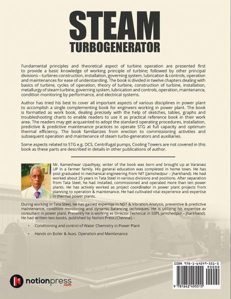 Fundamental principles and theoretical aspect of turbine operation are presented first to provide a basic knowledge of working principle of turbine; followed by other principal divisions - turbines construction, installation, governing system, lubrication & controls, operation and maintenances for ease of understanding. The book is divided in twelve chapters dealing with basics of turbine, cycles of operation, theory of turbine, construction of turbine, installation, metallurgy of steam turbine, governing system, lubrication and controls, operation, maintenance, condition monitoring by performance, and electrical systems. Author has tried his best to cover all important aspects of various disciplines in power plant to accomplish a single complementing book for engineers working in power plant. The book is formatted as work book, dealing precisely with the help of sketches, tables, graphs and troubleshooting charts to enable readers to use it as practical reference book in their work area. The readers may get acquainted to adopt the standard operating procedures, installation, predictive & predictive maintenance practices to operate STG at full capacity and optimum thermal efficiency. The book familiarizes from erection to commissioning activities and subsequent operation and maintenance of steam turbo-generators and auxiliaries. Some aspects related to STG e.g. DCS, Centrifugal pumps, Cooling Towers are not covered in this book as these parts are described in details in other publications of author.