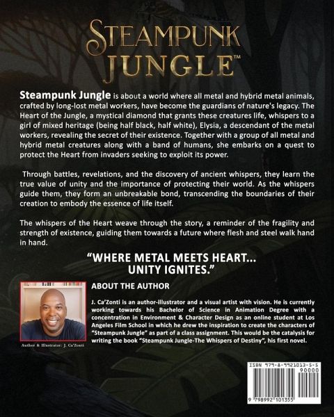 Steampunk Jungle is about a world where all metal and hybrid metal animals, crafted by long-lost metal workers, have become the guardians of nature's legacy. The Heart of the Jungle, a mystical diamond that grants these creatures life, whispers to a girl of mixed heritage (being half black, half white), Elysia, a descendant of the metal workers, revealing the secret of their existence. Together with a group of all metal and hybrid metal creatures along with a band of humans, she embarks on a quest to protect the Heart from invaders seeking to exploit its power. Through battles, revelations, and the discovery of ancient whispers, they learn the true value of unity and the importance of protecting their world. As the whispers guide them, they form an unbreakable bond, transcending the boundaries of their creation to embody the essence of life itself. The whispers of the Heart weave through the story, a reminder of the fragility and strength of existence, guiding them towards a future where flesh and steel walk hand in hand