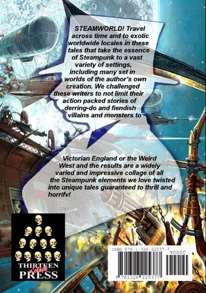 STEAMWORLD! Travel across time and to exotic worldwide locales in these tales that take the essence of Steampunk to a vast variety of settings, including many set in worlds of the author's own creation. We challenged these writers to not limit their action packed stories of derring-do and fiendish villains and monsters to Victorian England or the Weird West and the results are a widely varied and impressive collage of all the Steampunk elements we love twisted into unique tales guaranteed to thrill and horrify!