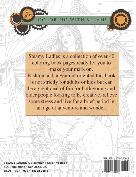 Steamy Ladies is a collection of over 40 coloring book pages ready for you to make your mark on. Fashion and adventure-oriented this book is not strictly for adults or kids but can be a great deal of fun for both young and older people looking to be creative, relieve some stress and live for a brief period in an age of adventure and wonder. The detailed illustrations may not be well-suited for very young children but with bold, thick lines should be a challenge for anyone of most ages.