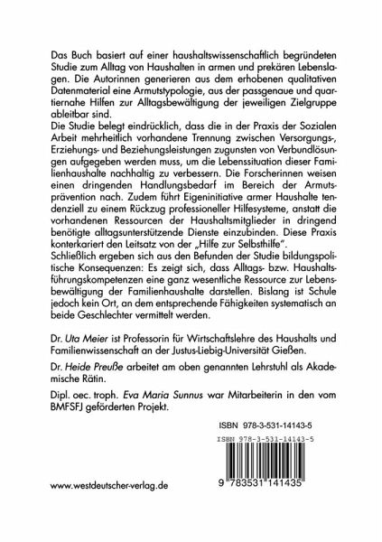 Das Buch basiert auf einer haushaltswissenschaftlich begründeten Studie zum Alltag von Haushalten in armen und prekären Lebenslagen. Die Autorinnen generieren aus dem reichhaltigen qualitativen Datenmaterial eine Armutstypologie, aus der passgenaue und quartiernahe Hilfen zur Alltagsbewältigung der jeweiligen Zielgruppe ableitbar sind.