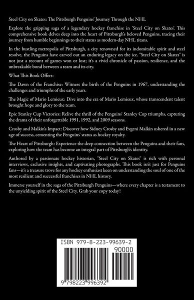 Steel City on Skates: The Pittsburgh Penguins' Journey Through the NHL Explore the gripping saga of a legendary hockey franchise in 'Steel City on Skates'. This comprehensive book delves deep into the heart of Pittsburgh's beloved Penguins, tracing their journey from humble beginnings to their status as modern-day NHL titans. In the bustling metropolis of Pittsburgh, a city renowned for its indomitable spirit and steel resolve, the Penguins have carved out an enduring legacy on the ice. "Steel City on Skates" is not just a recount of games won or lost; it's a vivid chronicle of passion, resilience, and the unbreakable bond between a team and its city. What This Book Offers: The Dawn of the Franchise: Witness the birth of the Penguins in 1967, understanding the challenges and triumphs of the early years. The Magic of Mario Lemieux: Dive into the era of Mario Lemieux, whose transcendent talent brought hope and glory to the team. Epic Stanley Cup Victories: Relive the thrill of the Penguins' Stanley Cup triumphs, capturing the drama of their unforgettable 1991, 1992, and 2009 seasons. Crosby and Malkin's Impact: Discover how Sidney Crosby and Evgeni Malkin ushered in a new age of success, cementing the Penguins' status as hockey royalty. The Heart of Pittsburgh: Experience the deep connection between the Penguins and their fans, exploring how the team has become an integral part of Pittsburgh's identity. Authored by a passionate hockey historian, "Steel City on Skates" is rich with personal interviews, exclusive insights, and captivating photographs. This book isn't just for Penguins fans-it's a treasure trove for any hockey enthusiast keen on understanding the soul of one of the most resilient and successful franchises in NHL history. Immerse yourself in the saga of the Pittsburgh Penguins-where every chapter is a testament to the unyielding spirit of the Steel City. Grab your copy today!