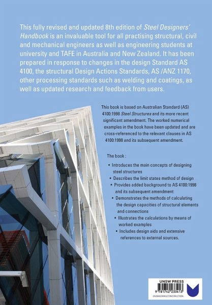 The Revised 8th Edition of Steel Designers' Handbook is an invaluable tool for all practising structural, civil and mechanical engineers as well as engineering students at university and TAFE in Australia and New Zealand. It has been prepared in response to changes in the design Standard AS 4100, the structural Design Actions Standards, AS /ANZ 1170, other processing Standards such as welding and coatings, updated research as well as feedback from users. This edition is based on Australian Standard (AS) 4100: 1998 and subsequent amendments. The worked numerical examples in the book have been extensively revised with further examples added. The worked examples are cross-referenced to the relevant clauses in AS 4100: 1998.