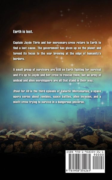 Earth is lost. Captain Jayde Thrin and her mercenary crew return to Earth to find a lost cause. The government has given up on the planet and turned its focus to the war brewing at the edge of humanity's borders. A small group of survivors are still on Earth fighting for survival and it's up to Jayde and her crew to rescue them, but an army of undead and alien worshippers are all that stand in their way. Steel for All is the third episode of Galactic Mercenaries, a space opera series about zombies, space battles, alien invasion, and a misfit crew trying to survive in a dangerous universe.
