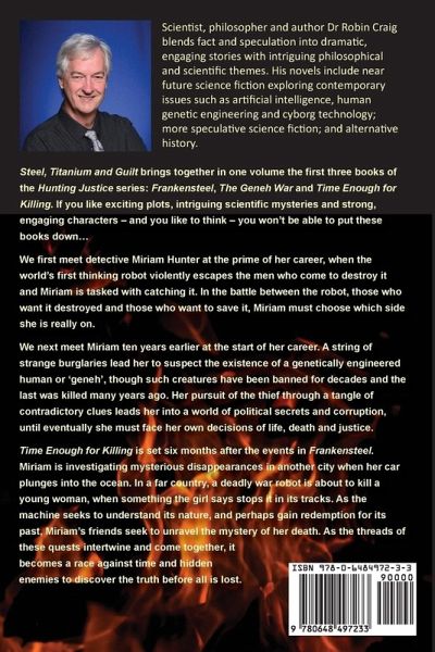 Steel, Titanium and Guiltbrings together in one volume the first three books of the Hunting Justiceseries: Frankensteel, The Geneh Warand Time Enough for Killing. If you like exciting plots, intriguing scientific mysteries and strong, engaging characters - and you like to think - you won't be able to put these books down… We first meet detective Miriam Hunter at the prime of her career, when the world's first thinking robot violently escapes the men who come to destroy it and Miriam is tasked with catching it. In the battle between the robot, those who want it destroyed and those who want to save it, Miriam must choose which side she is really on. We next meet Miriam ten years earlier, at the start of her career. A string of strange burglaries lead her to suspect the existence of a genetically engineered human or 'geneh', though such creatures have been banned for decades and the last was killed many years ago. Her pursuit of the thief through a tangle of contradictory clues leads her into a world of political secrets and corruption, until eventually she must face her own decisions of life, death and justice. Time Enough for Killingis set six months after the events in Frankensteel. While investigating mysterious disappearances in another city, Miriam's car plunges into the ocean. In a far country, a deadly war robot is about to kill a young woman, when something the girl says stops it in its tracks. As the machine seeks to understand its nature, and perhaps gain redemption for its past, Miriam's friends seek to unravel the mystery of her death. As the threads of these quests intertwine and come together, it becomes a race against time and hidden enemies to discover the truth before all is lost.