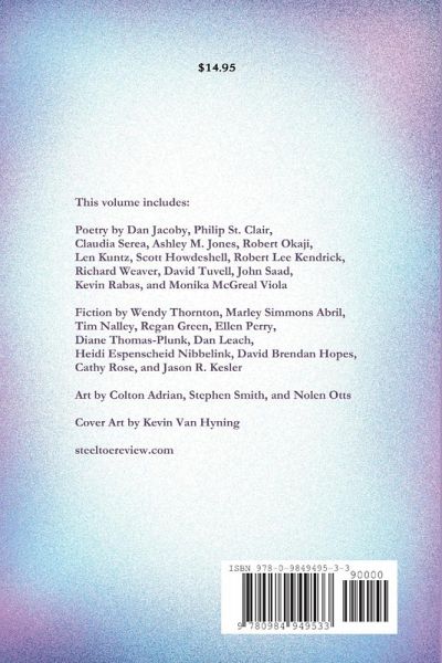 This volume includes: Poetry by Dan Jacoby, Philip St. Clair, Claudia Serea, Ashley M. Jones, Robert Okaji, Len Kuntz, Scott Howdeshell, Robert Lee Kendrick, Richard Weaver, David Tuvell, John Saad, Kevin Rabas, and Monika McGreal Viola Fiction by Wendy Thornton, Marley Simmons Abril, Tim Nalley, Regan Green, Ellen Perry, Diane Thomas-Plunk, Dan Leach, Heidi Espenscheid Nibbelink, David Brendan Hopes, Cathy Rose, and Jason R. Kesler Art by Colton Adrian, Stephen Smith, and Nolen Otts Cover Art by Kevin Van Hyning